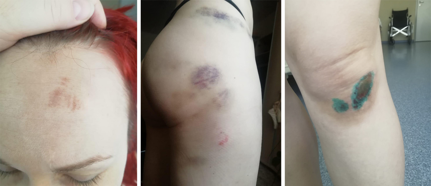 Затем Виктория и Юлия поехали в Пушкино в травмпункт, чтобы зафиксировать повреждения. У Кисляк врачи обнаружили (все медицинские документы есть в редакции «Медиазоны») множественные кровоподтеки размером от одного до 10 квадратных сантиметров в лобной области, на плечах и предплечьях, правом бедре и обеих голенях; ушибы лица, шеи, плеч, предплечий, обоих бедер и голеней, а также осаждения правой кисти, левого бедра и левой голени. У Ланской зафиксированы отек левой скулы, множественные ушибы лица, шеи, предплечий и грудной клетки, защемление правостороннего седалищного нерва; кроме того, медики заподозрили сотрясение головного мозга.