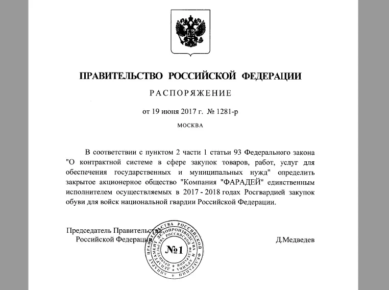 Андриановы давно делают обувь для силовых ведомств. А на некоторых рынках — они монополисты. В 2015 году правительство выпустило распоряжение и назначило «Фарадей» единственным поставщиком обуви для нужд всего МВД сроком на два года. В 2017 году действие монополии продлили еще на пару лет — на этот раз для Росгвардии. Это очень короткие документы всего в два пункта, там нет никакого пояснения, почему всю обувь для российской полиции, а затем гвардейцев будет поставлять одна компания.