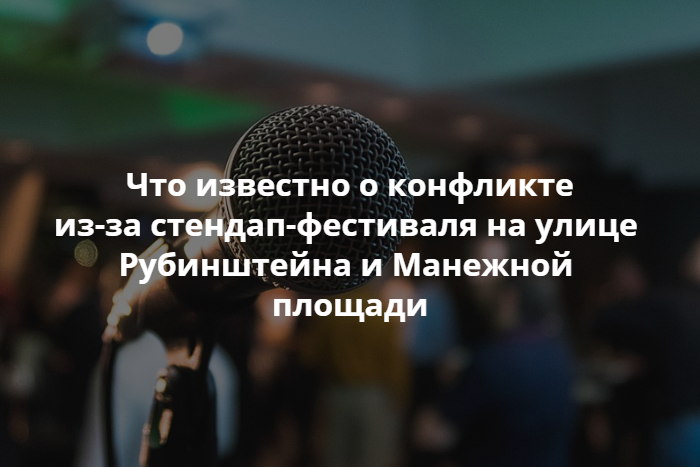 С 14 по 16 июня на Манежной площади и в барах на улице Рубинштейна пройдет стендап-фестиваль SPB 2K19 с артистами Comedy Club и открытым микрофоном. Против него выступают местные жители: они опасаются, что участники будут шуметь и курить под окнами. Изначально из-за фестиваля должны были перекрыть улицу Рубинштейна, но власти не согласовали мероприятие.