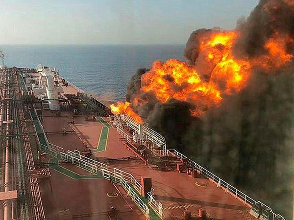 Пожар на атакованном танкере Сегодня утром два нефтяных танкера пострадали от взрывов в Оманском проливе. Экипаж одного из них назвал произошедшее атакой, компания, которой принадлежит другой попросила не спешить с выводами. На борту были россияне.