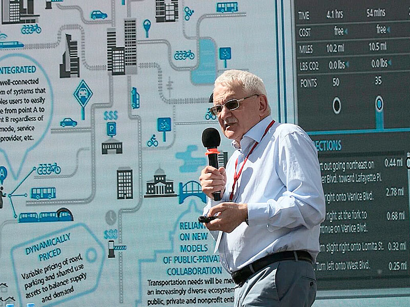 Дальше. Я рассказываю, что такое идея Мобилити 4.0. Мобильность обеспечивается совокупностью сервисов, а не собственным имуществом. Отсюда — все эти великолепные вещи, связанные с каршерингом, который в Москве поехал… замечательно поехал. Дальше. информация везде, и возникают IT-упакованные таксомоторные сервисы, которые делают революцию в таксомоторных перевозках. Это мы можем наблюдать… экспериментальный факт заключается в том, что Яндекс.такси, вызванный у порога нашего университета, приезжает быстрее, чем персональный автомобиль моего высокопоставленного собеседника. Это экспериментальный факт.