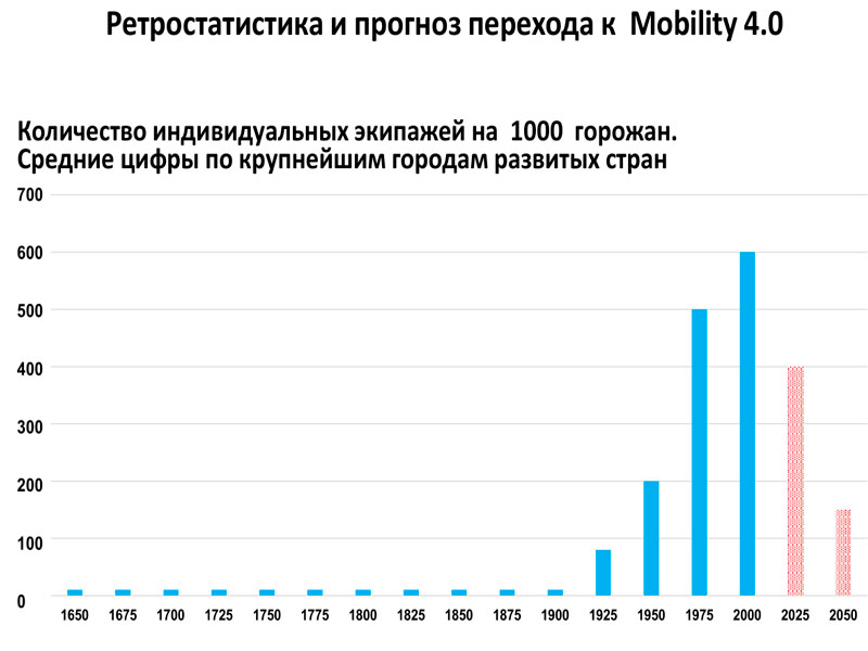 Михаил Блинкин. Фото: Алексей Никодимов / Полит.ру На техническом языке, вот если переводить то, что было сказано в поэтическом духе у Джоэля Гарро, речь идет вот о чем: сколько жителей как таковых, на двух ногах, и сколько кентавров, то есть жителей с индивидуальными экипажами, может вместить 1 гектар городской территории без особых потерь качества жизни? Этот вопрос был абсолютно ключевым в архаическую эпоху Мобилити 1.0. Эпоха Мобилити 1.0 — это вот Харон возил по реке Стикс за деньги известных пассажиров, они были покойниками, но у них всегда во рту лежала монетка, они платные пассажиры, вот это была Мобилити 1.0. И вот до нашей веселой эпохи Мобилити 4.0, о которой я расскажу дальше. Вот сколько может вместить город кентавров и людей — вот это очень интересная штука. Здесь история вопроса чрезвычайно любопытна. Только самые дотошные историки городов знают простую штуку — что от древности и до начала XX века, а именно до 1908 года, количество индивидуальных экипажей в городе никогда не превышало десятка единиц. Это вот в древней Ниневии или в Санкт-Петербурге 1900-го года, или в Лондоне 1900-го года. Почему? Потому что индивидуальный экипаж до великого изобретения Форда — это мне надо было иметь конюшню, каретный сарай, кучеров, конюхов и все это хозяйство. Понятно, что это сегмент лакшери, никакой массовостью это физически не могло быть. И вот индивидуальные экипажи до девятисотого года это десяточка, это вообще мелочь, ноль. Дальше начинается «революция» Форда и взрывной рост, пик которого приходится на первое десятилетие нашего века, когда в городах количество автомобилей на 1000 жителей — ну вот здесь средняя цифра по развитым странам 600, а если смотреть по городам мира, ну вот в Москве 400; во Владивостоке 650; в Соединенных Штатах сколько угодно городов, где людей и автомобилей более-менее поровну, 1000. Здесь средняя цифра. Но если брать опять же наблюдения больших городов за последние 20 лет, это тихонько пошло вниз, и вот мои коллеги… более-менее консенсусное мнение — что к середине века это упадет. Ну, нет, до 10 это не упадет никогда, но это сильно, сильно упадет. Потому что ну не помещается все это в городе, и вообще это достаточно нелепая штука — огромное количество железа, которое 22 часа в сутки стоит где-нибудь «на приколе». Значит, пойдем дальше.