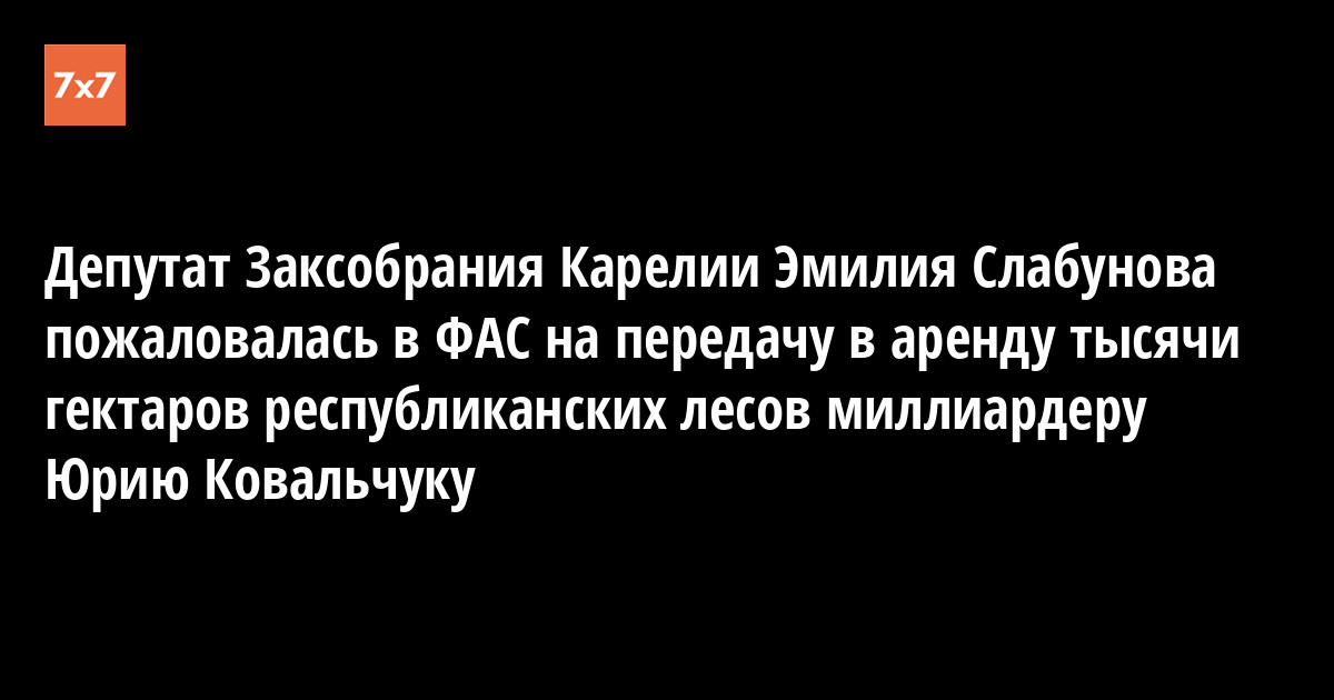 Депутат Законодательного собрания Республики Карелии Эмилия Слабунова пожаловалась в Федеральную антимонопольную службу на аукцион, по которому 1136,9 гектаров карельских лесов перешли в аренду на 20 лет фирмам бизнесмена Юрия Ковальчука. Об этом 13 июня сообщила пресс-служба партии «Яблоко».