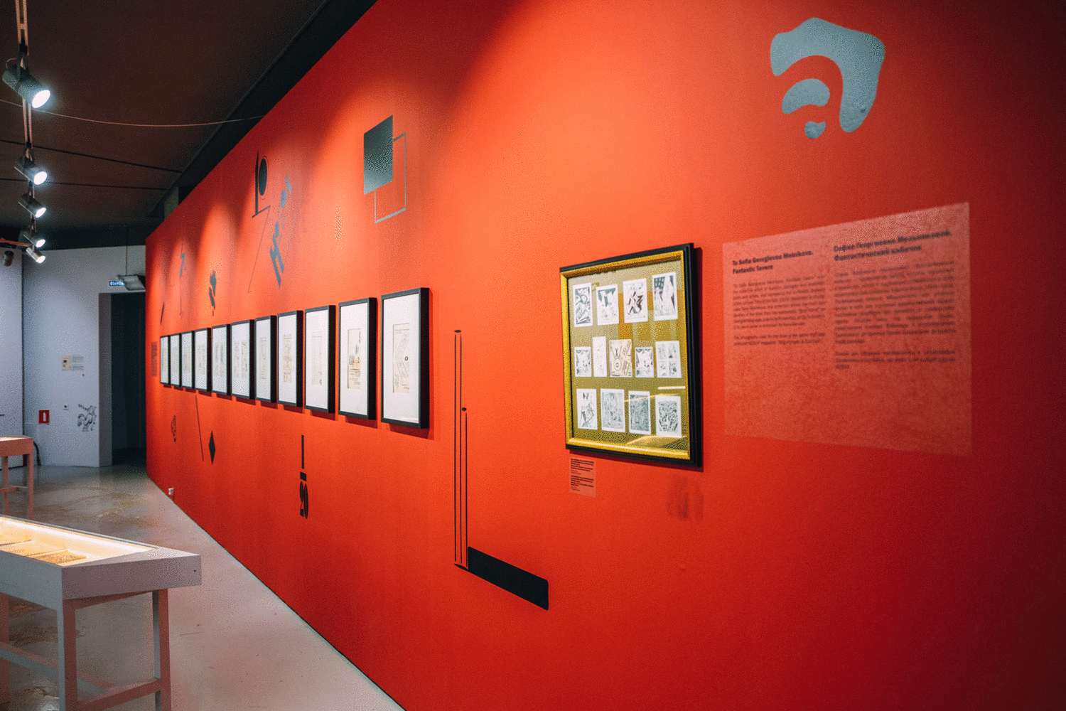 «Левее левизны». Вид экспозиции со страницами журнала Н2SO4 и сборником, посвященным Софии Мельниковой