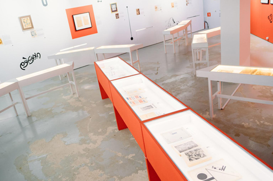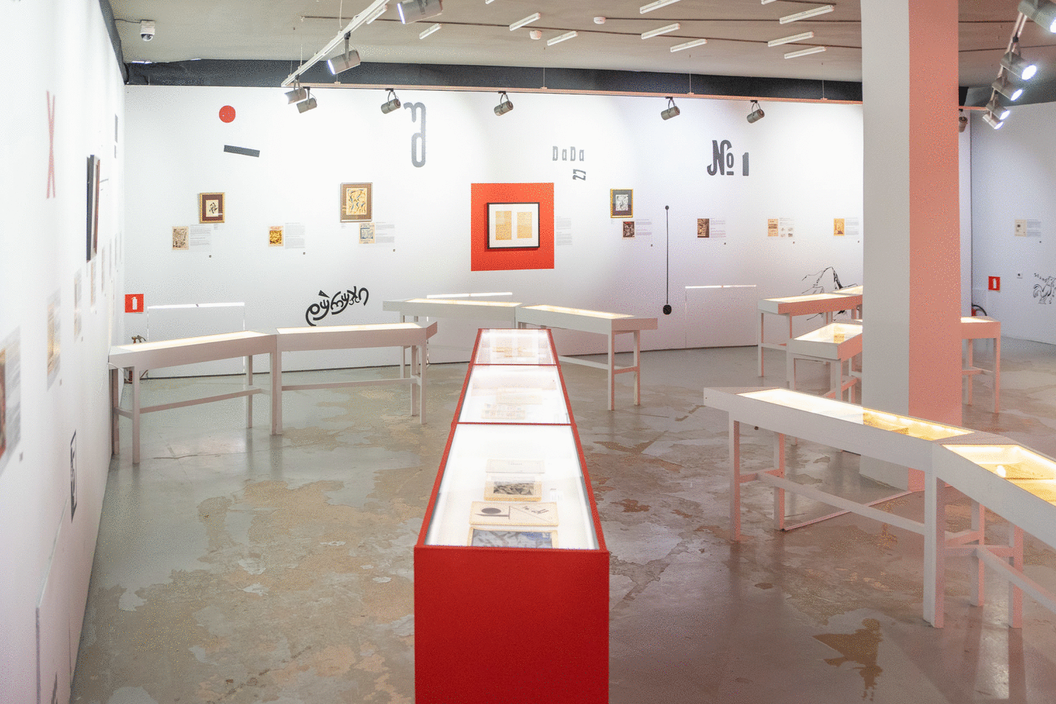 Вид экспозиции выставки «Левее левизны» — Образ аскетичный и сконцентрированный именно на шрифтовой культуре, но в то же время очень узнаваемый благодаря своей раскиданности, резкости.