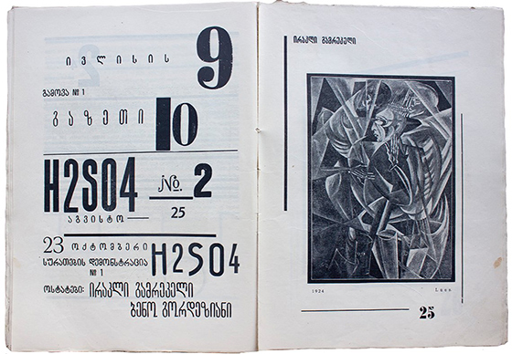 — Н2SO4 — это такая верхушка айсберга того, что происходило в Тбилиси в то время. Они издали абсолютно экспериментальный одноименный журнал — Н2SO4. Вот он у нас как раз представлен в полистовой развеске. Он попал в несколько важных библиографий, в Музей современного искусства в Нью-Йорке и регулярно попадает в каталоги российского и советского авангарда. В группу Н2SO4 входили молодые грузинские художники и поэты, ведомые литературным лидером Симоном Чиковани. Он и составил манифест этой группы при поддержке поэтов-футуристов и дадаистов. В деятельности группы принимали участие и два художника, отвечавших за дизайн журнала. Один из них — это Бено Гордезиани, который всю жизнь посвятил дизайну шрифта и, видимо, как раз придал журналу этот запоминающийся облик.