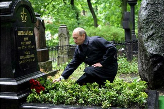 Владимир Путин возлагает цветы на могилу Ивана Шмелёва.
