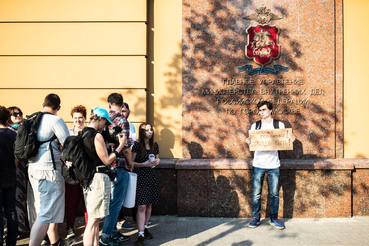 Yevgeny Feldman for Meduza Individual pickets outside Moscow’s police headquarters at 38 Petrovka Street. June 7, 2019.