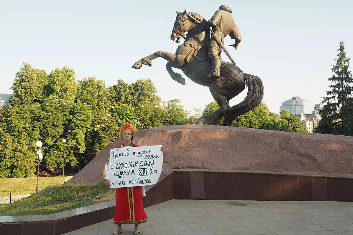Через неделю Керносова провела одиночный пикет на том же месте, в русском народном костюме и с плакатом: «Против продажи земли с археологическими находками XIII века. #заборьевскийлесок». Еще через пару дней она нарядилась Царевной-Лягушкой, встав с плакатом: «Я скорее шкурку сброшу, чем отдам наш лес хороший».