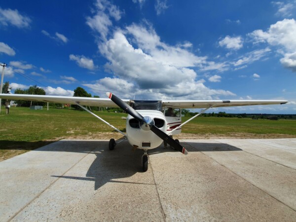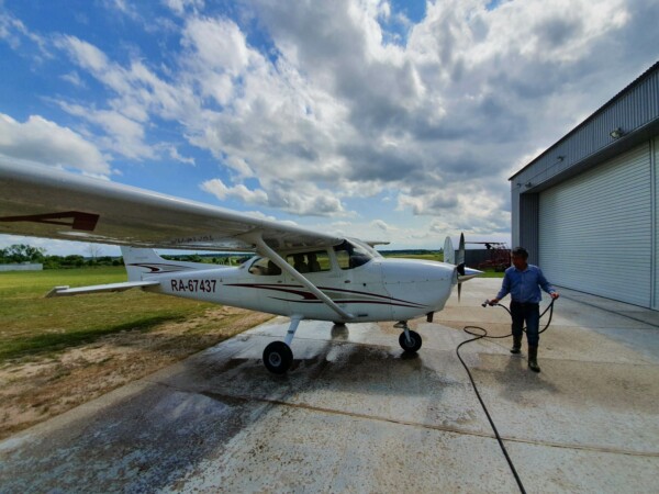 Самолёт в фирме на ходу один. Модель — самая популярная из легкомоторных, Cessna 172 Skyhawk: два сиденья для пилотов спереди и одно пассажирское сзади. Двигатель у него один, развивает скорость до 120 узлов (около 220 км/ч), а топливных баков хватит примерно на шесть часов полёта.
