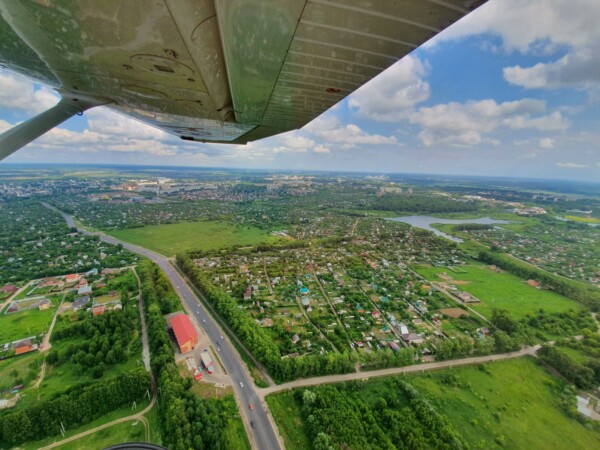 В воздухе интересного происходило немного: я наблюдал за действиями пилота, пока он чуть корректировал незамысловатый курс вокруг Коломны, а также реагировал на указания диспетчеров по поводу занимаемой высоты. Обычно легкомоторные летают на уровне 300-500 метров над землёй, но иногда им говорят снижаться или наоборот подниматься сильнее.