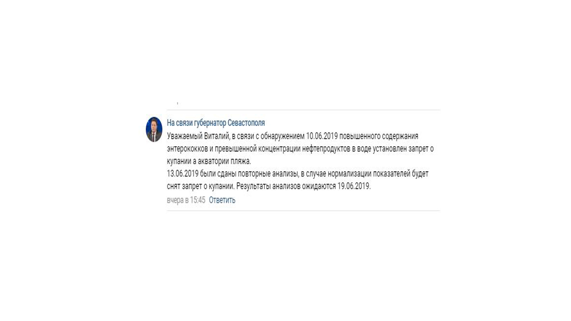 «Уважаемый Виталий, в связи с обнаружением 10.06.2019 повышенного содержания энтерококков и превышенной концентрации нефтепродуктов в воде установлен запрет о купании а акватории пляжа.