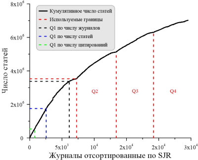 Почему же существует настолько неравномерное распределение количества статей? Ответ почти очевиден: это всем выгодно. Для крупных издательств научные журналы представляют собой в первую очередь продукт, который можно продавать, и чем выше его статус, тем охотнее его покупают, а спрос рождает предложение. С точки зрения издательств, есть два пути увеличения количества публикуемого материала: (1) создание новых журналов и (2) увеличение объема статей в уже существующих. Первый путь куда более трудозатратный, так как «раскрутка» нового журнала займет минимум несколько лет, тогда как увеличение объема статей в уже существующем журнале принесет почти мгновенную отдачу. При этом дефицита научных статей не возникает, так как ученые тоже материально заинтересованы в публикации своих работ журналами из Q1. Эти данные позволяют мне выдвинуть гипотезу о том, что неравномерное распределение количества статей по квартилям вызвано (по крайней мере отчасти) самим разделением научных журналов на квартили по импакт-фактору. Одним из аргументов в пользу этой гипотезы является тот факт, что, к примеру, на рис. 1 можно увидеть точки перехода между разными квартилями, в которых меняется наклон кумулятивной кривой количества опубликованных статей.