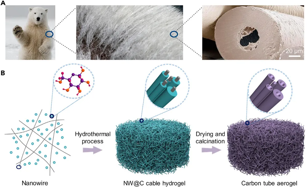 Исследователи из Научно-технического университета Китая (USTC), работающие под руководством Шу-Хон Ю (俞书宏, Shu-Hong Yu, [5]), решили получить материал, имитирующий строение шерсти полярного медведя. Для этого они синтезировали миллионы полых углеродных трубок, каждую из которых можно рассматривать как отдельный волосок полярного медведя. Полые углеродные трубки объединялись в новый материал — теплоизолирующий аэрогель.