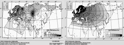 Частота встречаемости дефектного гена CCR5 сильно отличается у представителей разных этнических групп (рис. 1). Самая высокая частота у эстонцев и северных русских — более четверти являются носителями одной или двух копий дефектного гена. К югу и востоку частота снижается, составляя в Южной Европе лишь 5–10% носителей одной дефектной копии и существенно менее 1% носителей двух таких копий. А у коренного населения Центральной и Южной Африки, Юго-Восточной Азии и Нового Света этот вариант гена практически не встречается ([6, 7]).