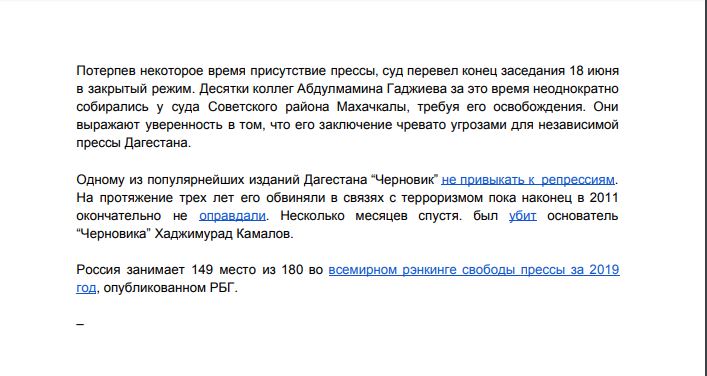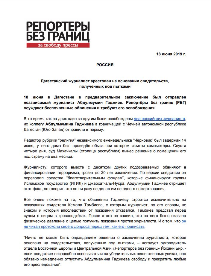 Следствие в деле редактора отдела "Религия" дагестанского еженедельника "Черновик" Абдулмумина Гаджиева не основано на убедительных вещественных уликах, в связи с чем журналист незамедлительно должен быть освобожден, заявлил руководитель отдела Восточной Европы и Центральной Азии "Репортеров без границ" Йоханн Бир.
