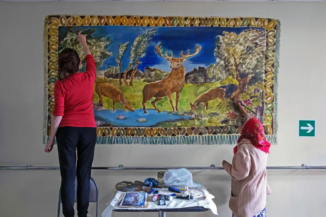 Кроме азов рисунка она занимается с бабушками/дедушками современным искусством, возит их на выставки. Посмотрели, например, экспозицию Павла Пепперштейна. Коллективное искусство бывает вполне прагматичным — в Товарковском доме престарелых в Тульской области, где Муромцева проводит больше всего времени, бабушки с ее помощью расписали стены коврами — теми классическими коврами советской поры, которые украшали многие дома: с оленями и тремя богатырями. Говорят, бахрома получилась настолько реалистичной, что многие пытались пощупать и даже отодрать кусочек на память. Не получилось, как и не выйдет никогда привезти на выставку эти неснимаемые ковры. По завершении росписей устроили вернисаж, правда, по настоятельному предложению администрации — безалкогольный. Поначалу почти всюду к Катиной инициативе относятся с легким недоверием, но потом принимают ее почти как родную, она живет в пансионатах порой неделями, а между приездами сами бабушки звонят ей по мобильному.