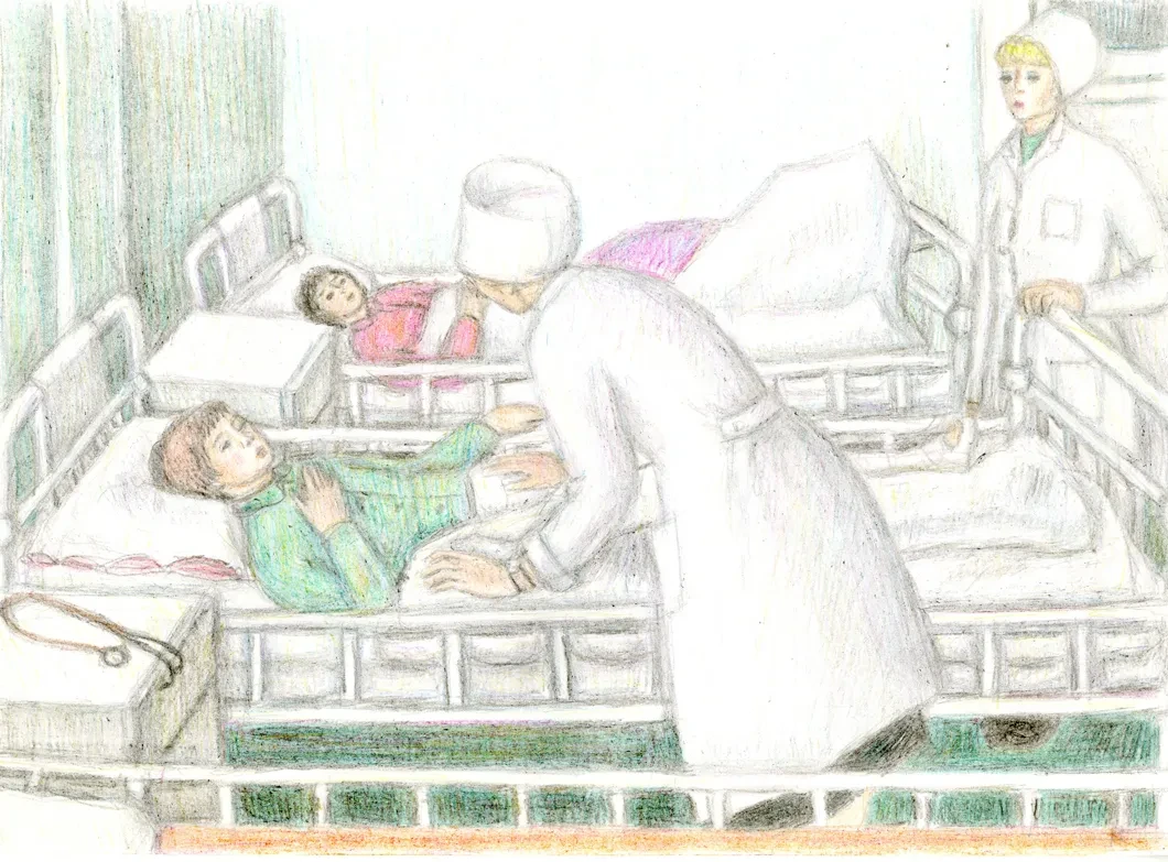 Почти все ее соавторы по «Лучше хором» начали рисовать уже в пожилом возрасте благодаря Кате. Впрочем, бывают и исключения — помимо Игоря Михайловича (его уже нет с нами) профессионалом можно назвать Ольгу Роговую. (В доме-интернате для престарелых и инвалидов «Сосновая усадьба» в Пионерском в Калининградской области она давно. Ольга не говорит и не слышит, она общается лишь при помощи ручки и бумаги.) Она рисует натюрморты, пейзажи и свою жизнь: медсестер и врачей, больничные коридоры и палаты. Ее медицинскую серию тоже выставили в Пересветовом переулке, на противоположной стене — рисунки и картины бабушки Жени, Евгении Михайловны Ереминой, когда-то работавшей проводницей в поездах дальнего следования, а в 73 года решившей стать художником. Теперь у нее есть даже аккаунт в инстаграме babushka_jenya; интереснейший artist-talk с нею выложен на ютубе. Главные хиты подборки — две обнимающиеся обезьяны, напоминающие о поцелуе Брежнева и Хонеккера (Евгения Михайловна не скрывала историко-политических аллюзий), а также заросший волосами древний человек времен ледникового периода. Охрана «Гаража», где Муромцева уже как-то выставляла творчество бабушек, пыталась не выпустить из здания картину «Небритый мужчина», впечатлились лишь объяснением самой бабули Жени: «Видите, у него нет сейчас бритвы, — сказала та охраннику, — я его побрею и верну на место». Охранник согласился.
