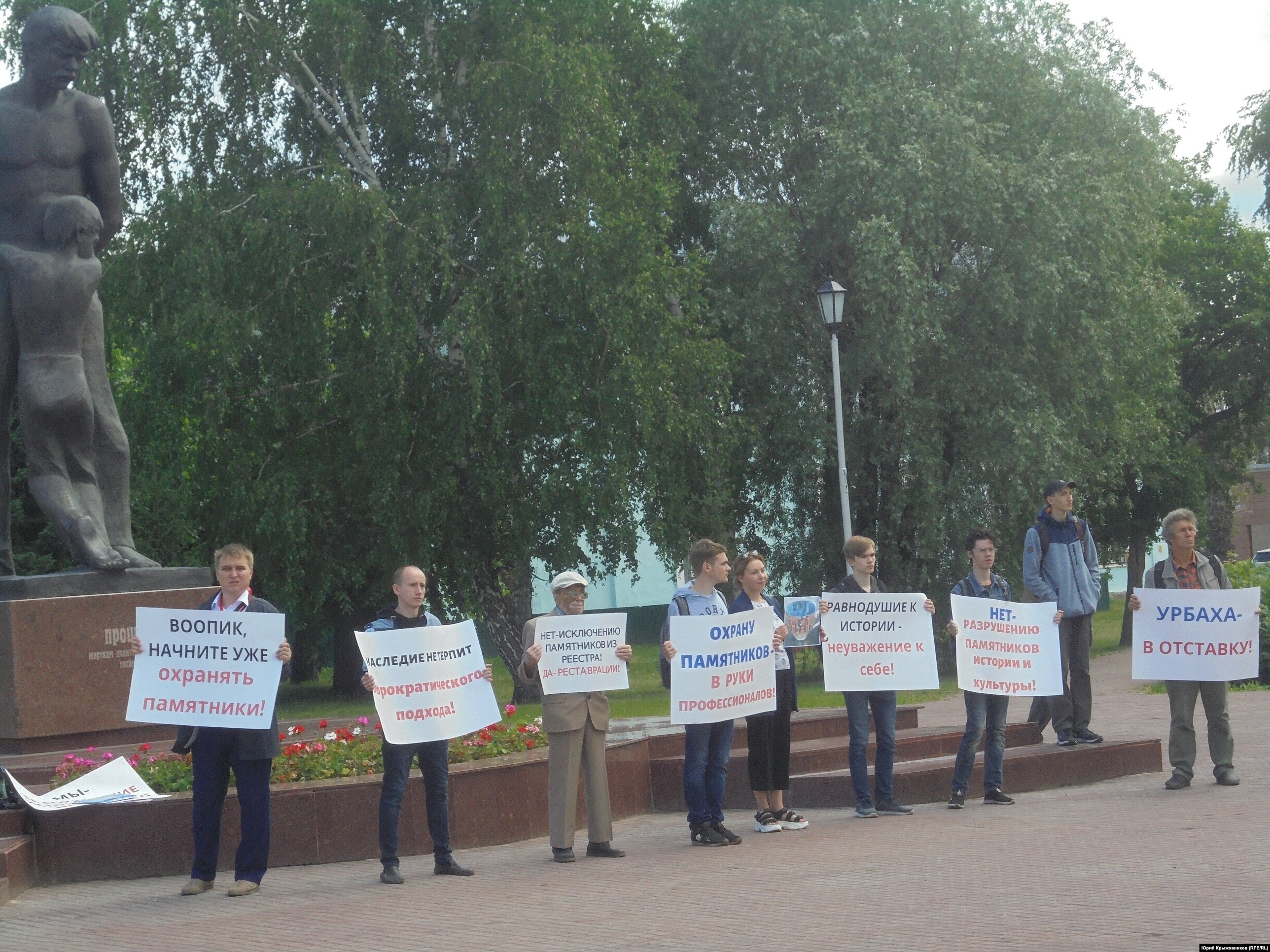 Около 50 человек собрались в Барнауле на митинг в защиту исторического наследия Алтайского края. Участники акции потребовали от региональных чиновников заняться реальной защитой объектов исторического наследия края, а в случае неспособности – уйти в отставку.