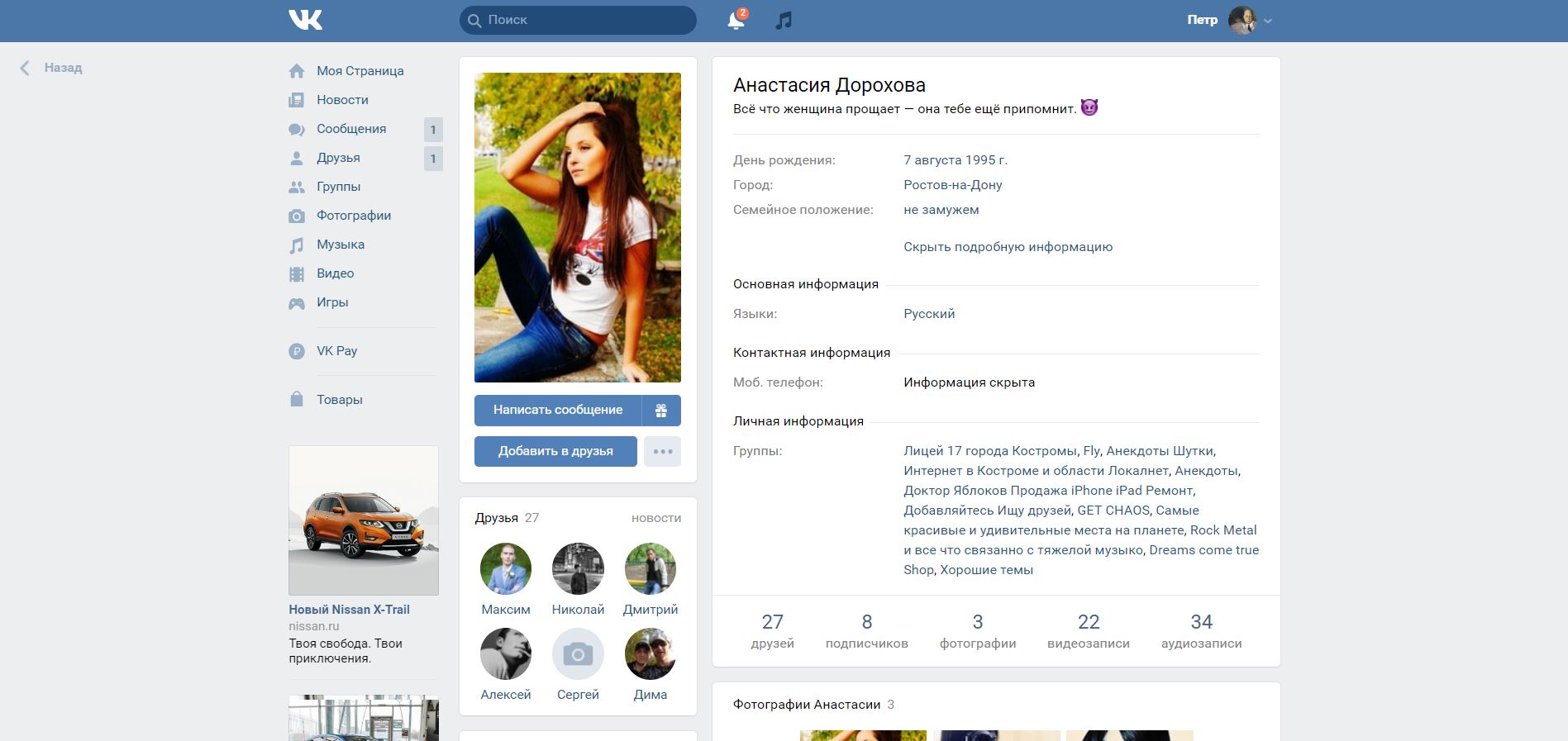 - В последний раз «Дорохова» заходила в аккаунт 9 июля 2015 года. Последний статус, выставленный «Дороховой», — «Все что женщина прощает — она тебе еще припомнит».