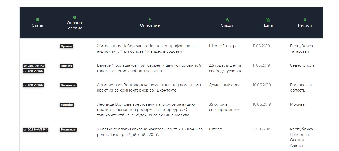 Сейчас на сайте собраны новости о делах в отношении интернет-пользователей с января 2015 года. Также активисты собрали статистику уголовных дел за публикации в интернете с 2015 года. К тому же на сайте есть деление по количеству дел по социальным сетям.
