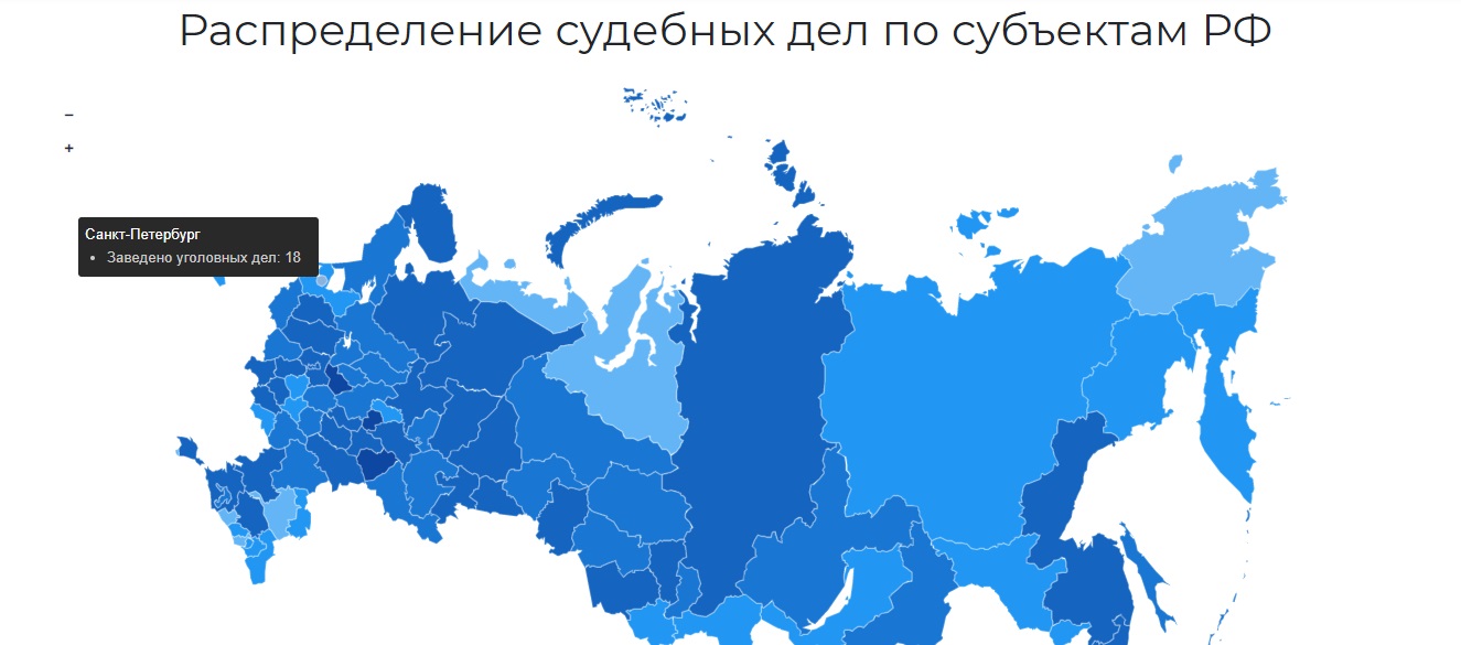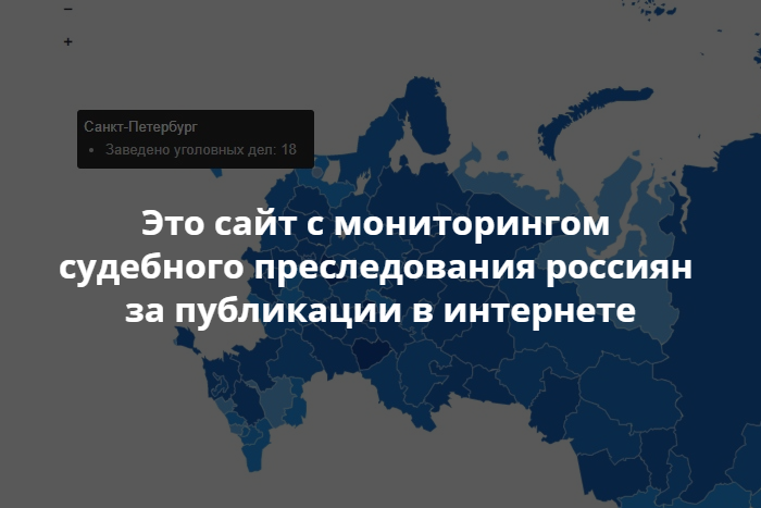 Авторы составили карту распределения судебных дел по субъектам РФ. По их данным, с 2015 года в Петербурге заведено 18 уголовных дел в отношении интернет-пользователей.