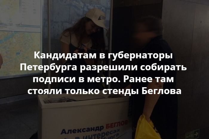 В начале июня в петербургском метро начали собирать подписи для выдвижения Беглова в губернаторы. При этом, по правилам метрополитена, любая агитационная деятельность там запрещена. С жалобой на это в городскую избирательную комиссию обратился координатор «Красивого Петербурга» Красимир Врански, который отказался от идеи участвовать в выборах губернатора из-за их «нелегитимности».