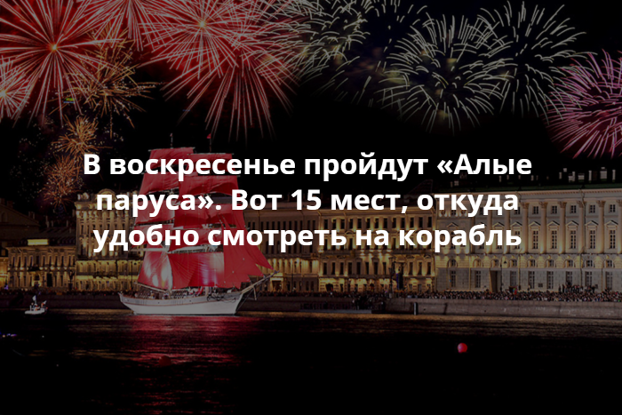 В ночь на 24 июня в Петербурге пройдет ежегодный праздник «Алые паруса». Попасть на него по билетам могут только выпускники. «Бумага» собрала список мест, откуда остальные петербуржцы и туристы могут любоваться праздничным салютом, световым шоу и алыми парусами брига.