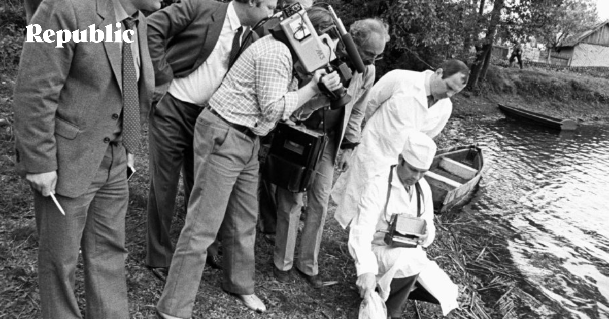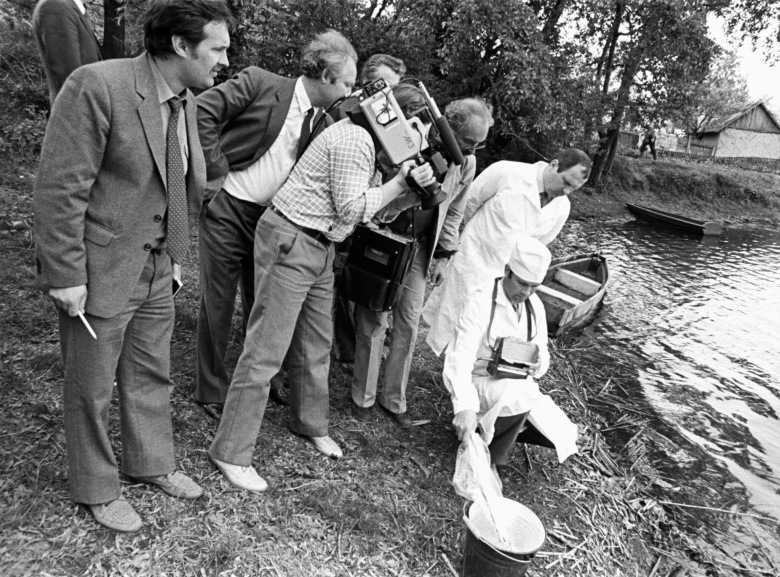 Иностранные корреспонденты наблюдают, как ведется дозиметрический контроль в районе Чернобыльской АЭС, 1986 год