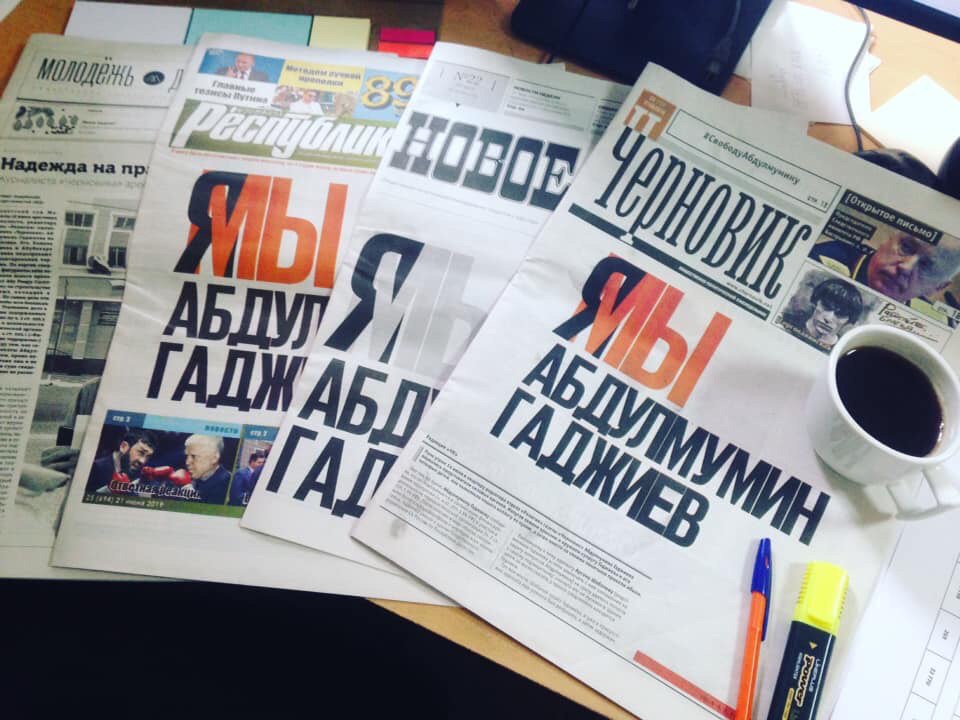 Три дагестанские газеты, «Новое дело», «Свободная республика» и «Черновик», вышли с одинаковыми обложками в знак солидарности с арестованным журналистом Абдулмумином Гаджиевым. Об этом сообщается в телеграм-канале о деле Гаджиева.
