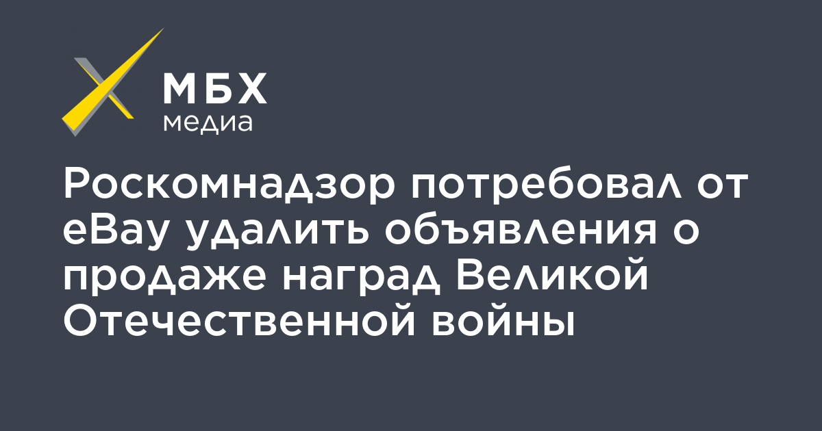 «На основании поступивших в Роскомнадзор судебных решений в американскую интернет-компанию eBay направлены требования об удалении объявлений в отношении 32 страниц сайта. На них содержится информация о продаже орденов и медалей Великой Отечественной войны, а также иных государственных наград и знаков отличия», — говорится в сообщении.