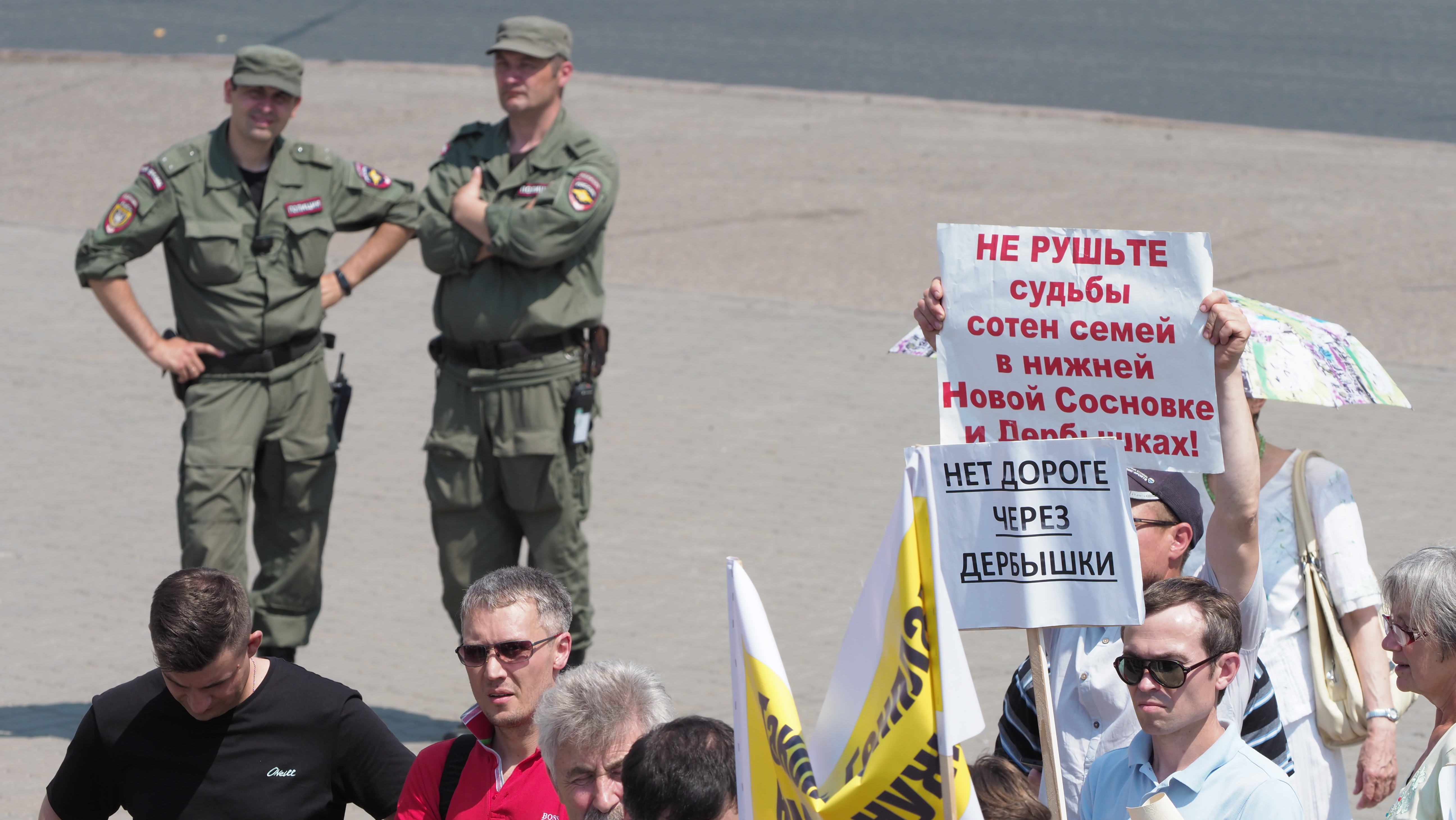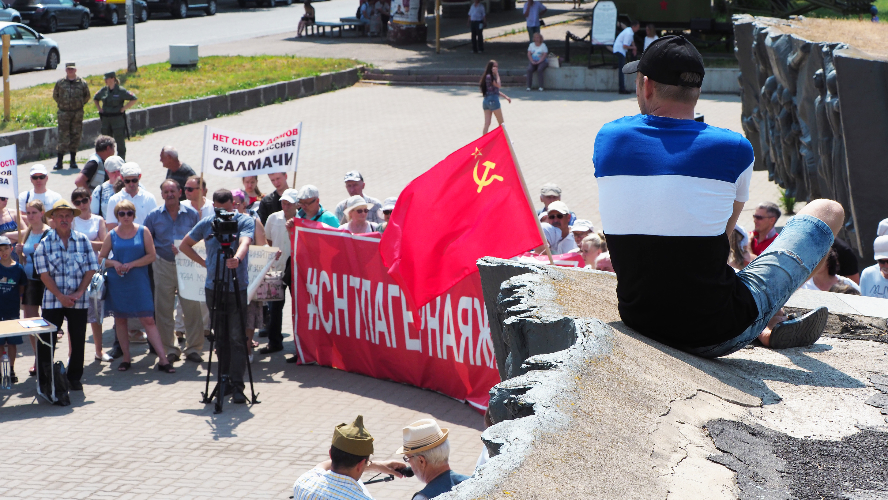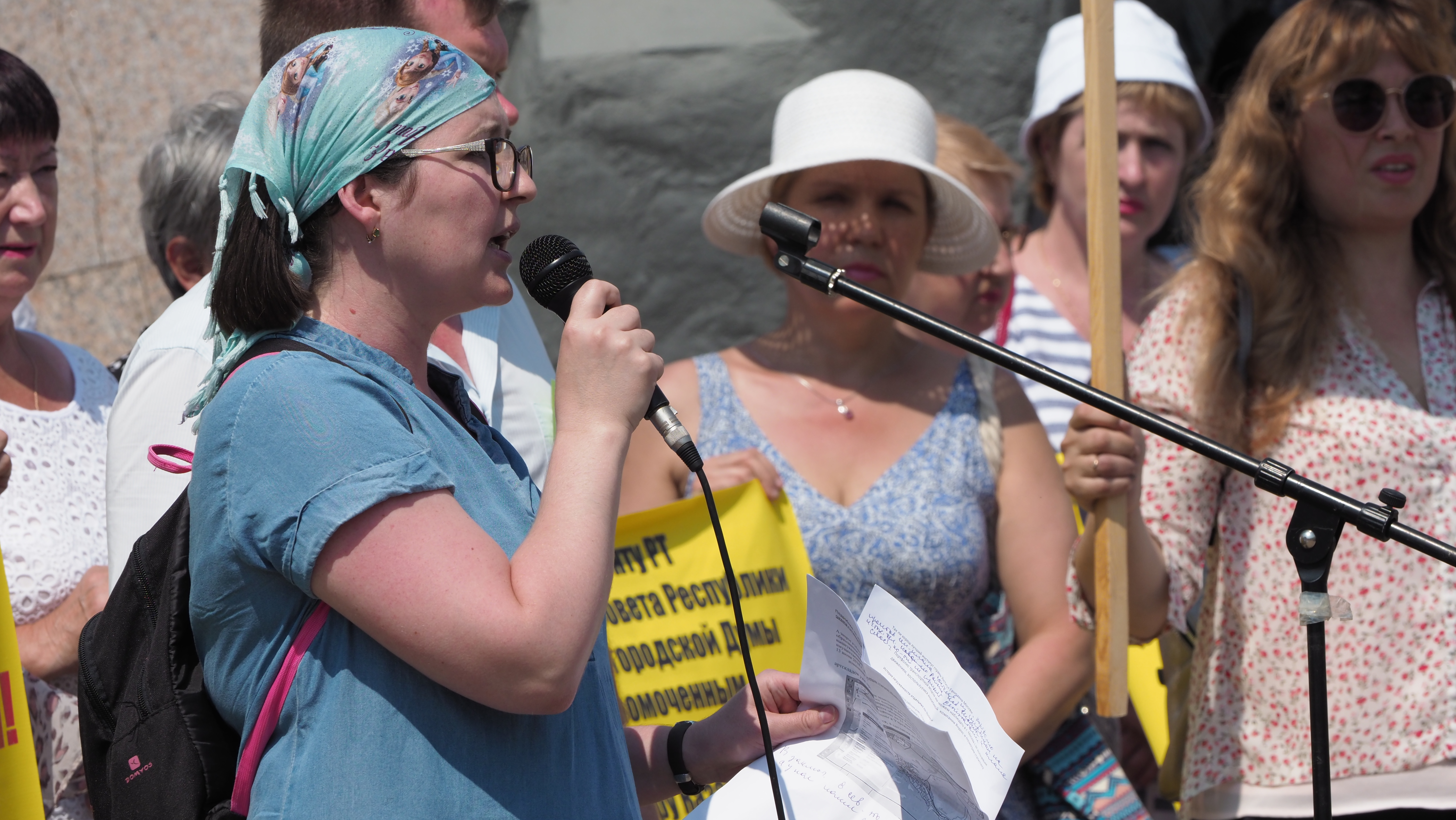 Если бы мэрия Казани разрешила митинг там, где это планировалось изначально, — на лужайке у Старых Горок, люди могли бы укрыться в тени деревьев. Но мэрия отказала, сославшись на то, что митингующие потопчут кусты и траву (уточним: и в действующем Генплане и в том, что стал "виновником торжества", участок предназначен под застройку). И предложила перенести мероприятие в Парк Петрова — на другой конец города. Несмотря на это обстоятельство и на то, что сегодня в Казани отмечали Сабантуй (он, кстати, ознаменовался давкой из-за ожидания высоких гостей), к 11 часам в парке собрались несколько сотен человек.