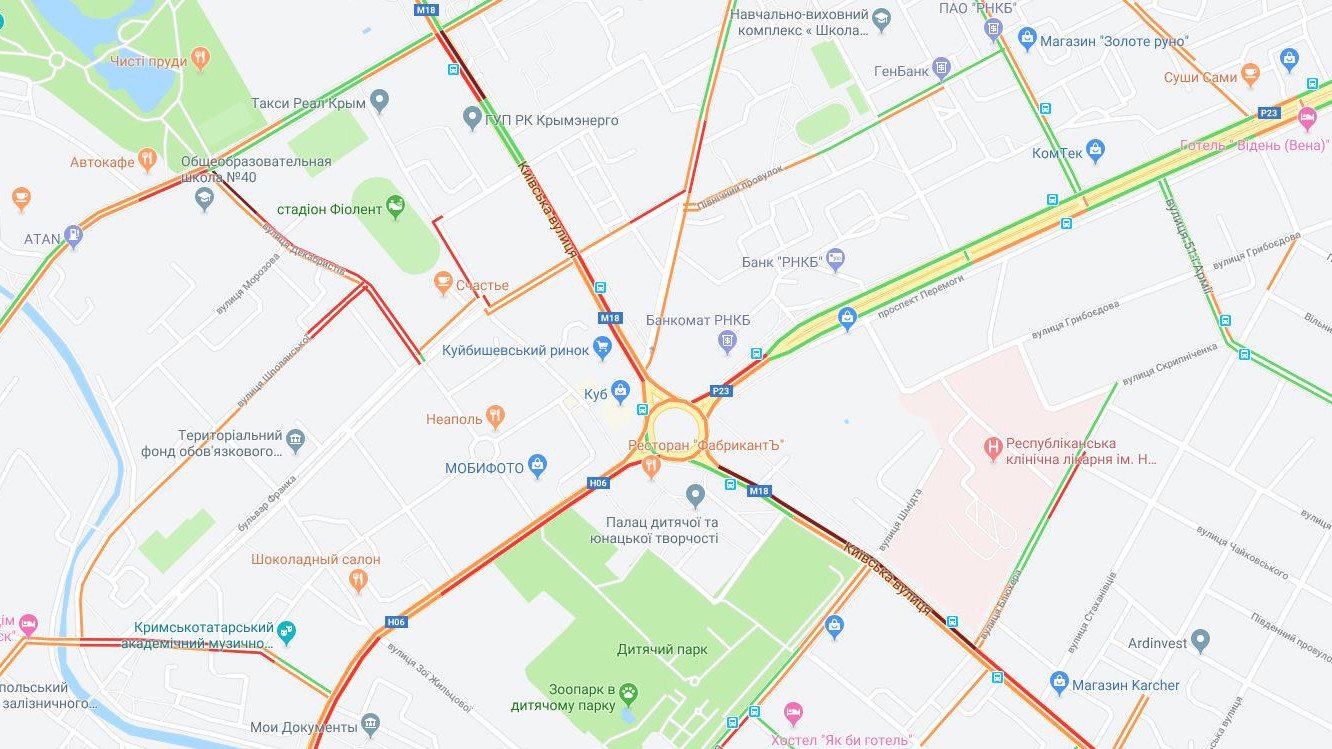 Согласно данным сервиса Google Карты, на дорогах в центре Симферополя образовались пробки.