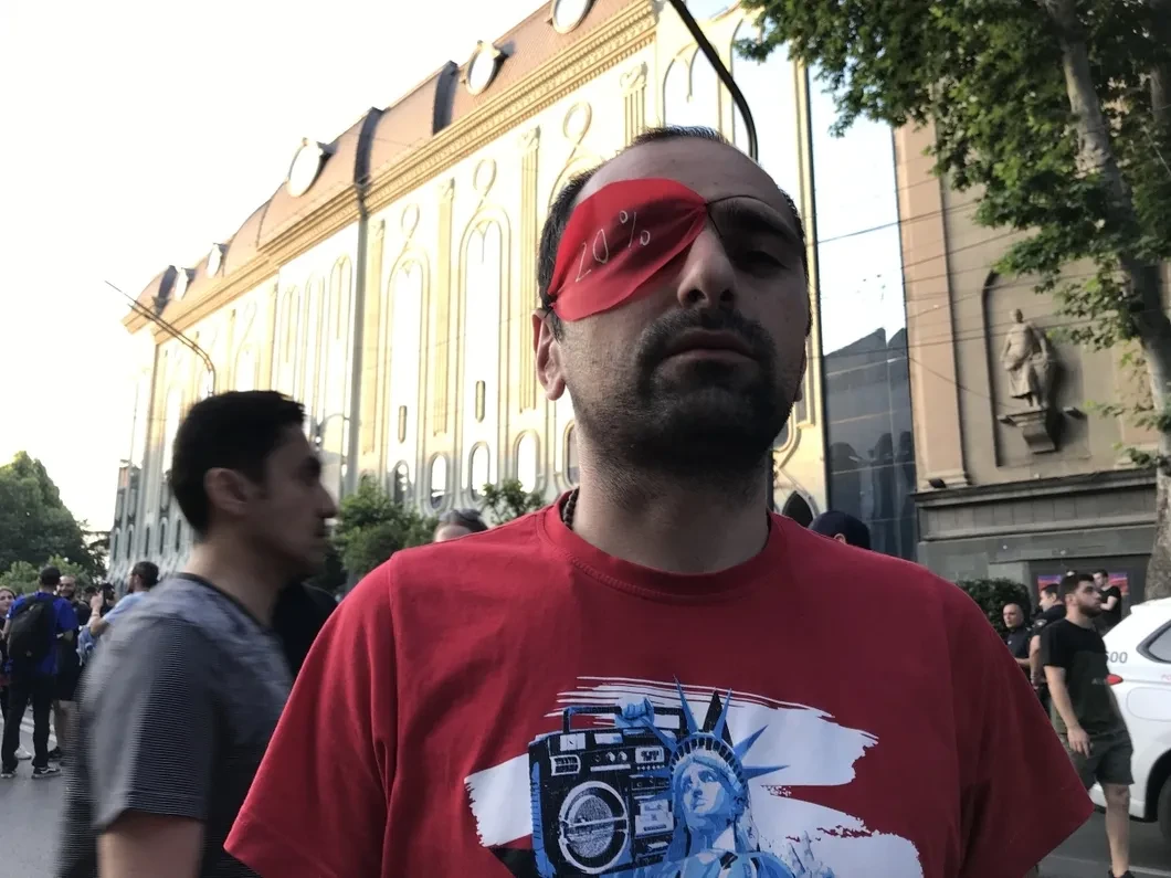 В пятницу протесты продолжились. Все тот же основной лозунг: «Россия — оккупант»; все те же требования — отставка глав силового блока. Но появилась и злость на агрессию властей. Многие надели повязки на глаза — в поддержку тех, кто ночью пострадал от резиновых пуль. На повязках написано маркером «20%». На рукописных плакатах: «Свобода просто не приходит, свободу надо завоевать», «Гахария (глава грузинского МВД. — Ред.) меня ослепляет».