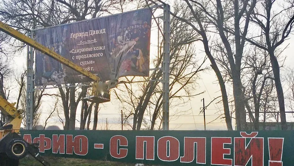 От Краснодара до Кореновска — чуть больше часа езды на машине. На подъезде к городу автомобилистов встречает репродукция полотна голландского художника Герарда Давида «Сдирание кожи с продажного судьи». Год создания — 1498-й. В 2019 году на примыкающем к федеральной трассе М4 «Дон» творение Герарда Давида установил колхоз им. Кирова.
