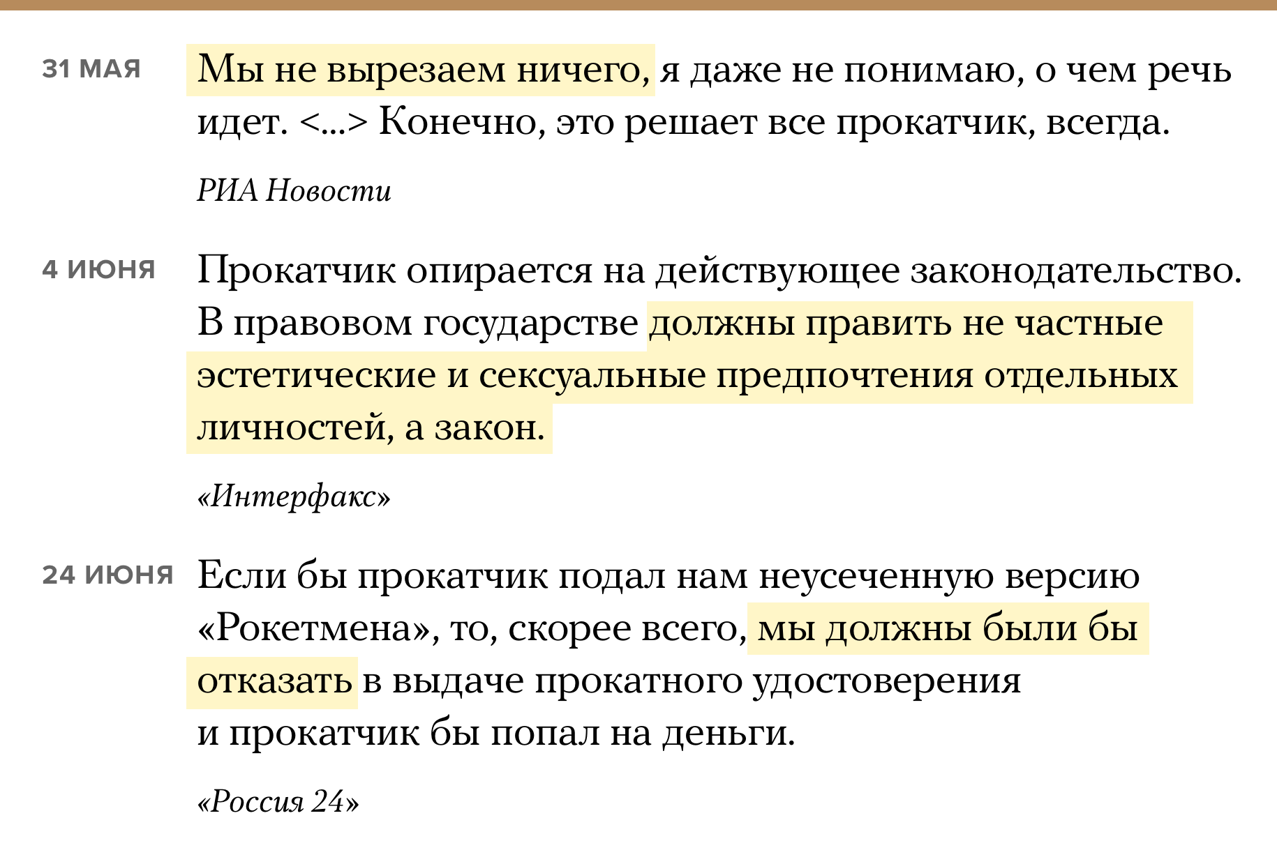 Министр культуры РФ Владимир Мединский 24 июня в программе «Диалог» на «России 24» вновь прокомментировал выход в российский прокат усеченной версии биографического фильма об Элтоне Джоне «Рокетмен». Из фильма вырезали сцены однополого секса и употребления наркотиков. По словам Мединского, версия фильма без купюр не получила бы прокатное удостоверение. Ранее чиновник утверждал, что Минкульт не вмешивается в действия прокатчиков, но потом заявил, что содержание фильмов должно соответствовать закону.