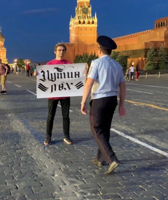 Видеоблогер Руслан Соколовский вышел на Красную площадь с плакатом «Путин лох». Его задержали