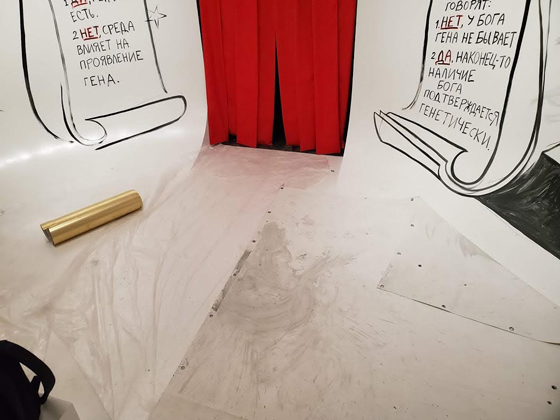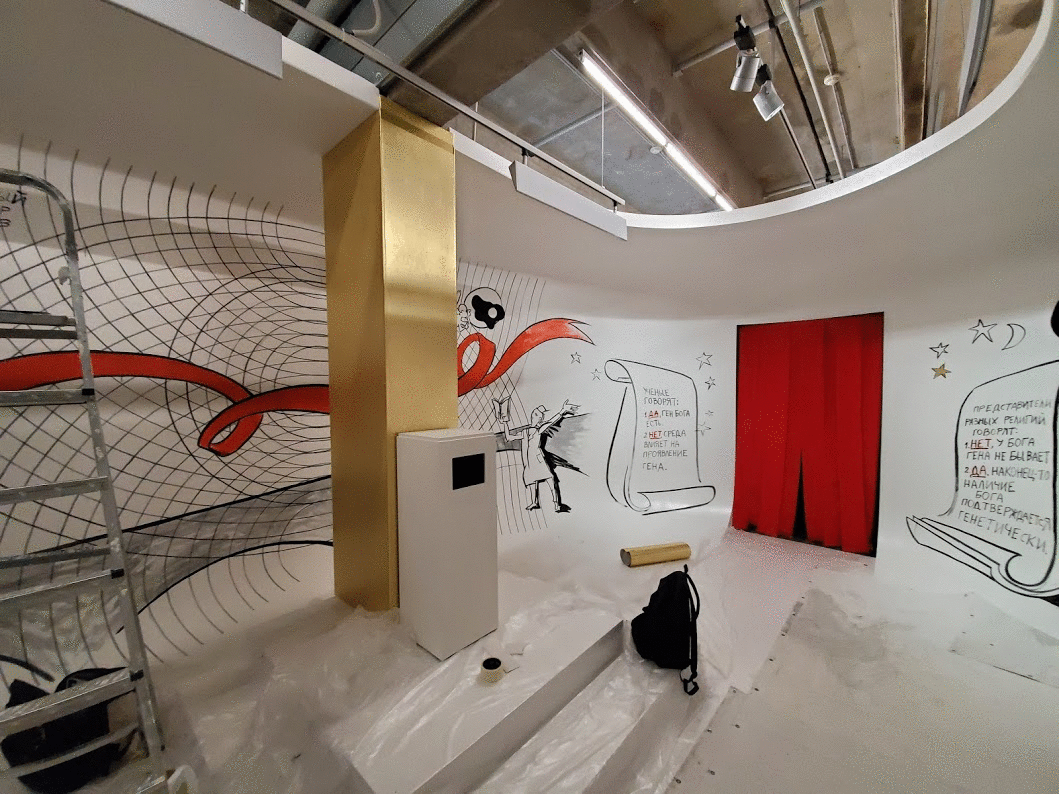 — Конечно, это было сделано осознанно. С формальной точки зрения я люблю какой-то фокус, чтобы зритель смог выделить главное, откуда начать читать и так далее. Роспись будет видна в приглушенном свете: кроме того, здесь будет монитор, а на нем — 10-минутное видео с моим рассказом: есть там документальные кадры, немного анимации, контраст. И, конечно, колонна, которая имеет функцию центра.