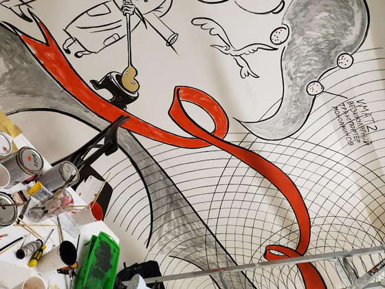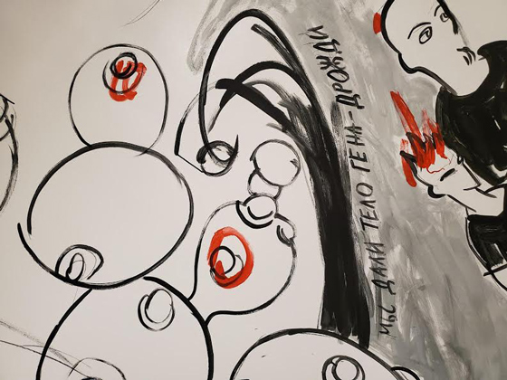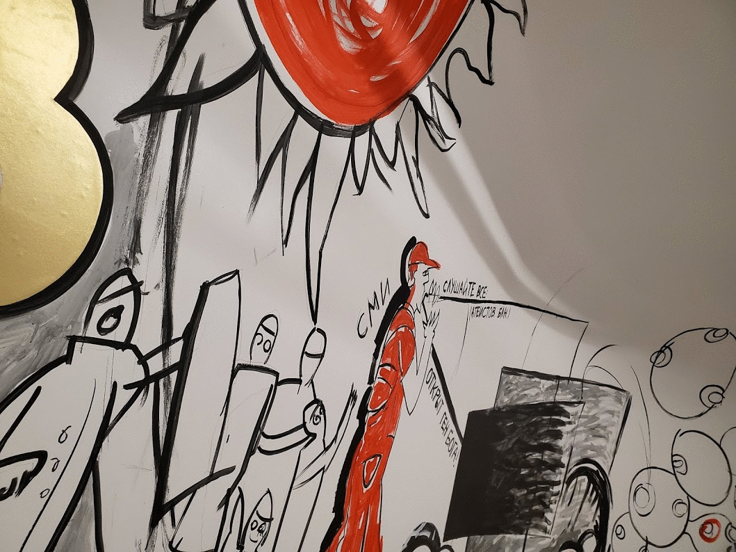 — Но если твое медийное искусство все чрезвычайно тщательное и даже во многом классичное, то фреска совсем другая: размашистый, стремительный штрих, эскизный «газетный» рисунок…