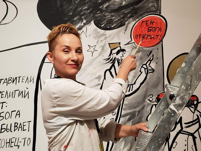 — Я люблю рисунок, потому что он очень непосредственен: я много рисую, и мои работы часто именно экспрессивны. В рисунке гораздо лучше видна индивидуальность художника. Мне сейчас помогал ассистент, и я немного испугалась, что он не сможет работать в моей манере, повторить мой жест, мазок кисти. Это я и люблю в росписи — жест, спонтанность. А так роспись похожа на рисунок, но в принципе это стенопись. Есть такое болгарское слово «стенопись», когда пишешь на стене. История росписей начинается с граффити в пещерах — таких, как Ласко. Ведь это тоже практически рисунки: сложнейшие, многослойные реалистические изображения появляются гораздо позже.