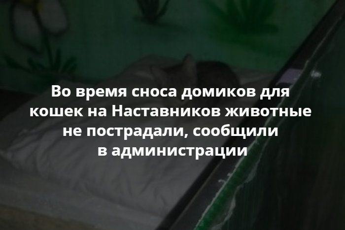 Во время сноса домиков для животных на углу проспекта Наставников и Хасанской улицы ни одна из кошек не пострадала, рассказали «Бумаге» в администрации Красногвардейского района. Ранее местные жители сообщили, что спецтехника сносила домики в то время, когда животные были внутри.