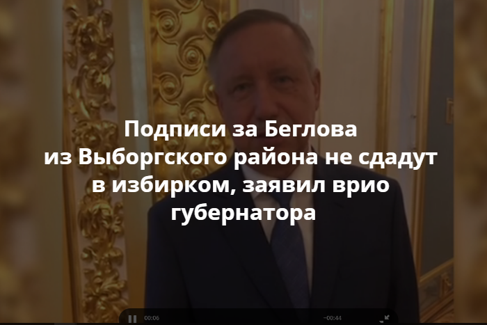 — Во время выборов не только в нашем городе, но и во всем мире существовали спекуляции, то же самое произошло и в Выборгском районе. Я обратился в правоохранительные органы, чтобы они разобрались, что это: провокация или злой умысел. Но в связи с тем, что есть политические спекуляции, я принял решение о том, что те подписи, которые были собраны в Выборгском районе, мы не будем сдавать в избирательную комиссию, — заявил Беглов.