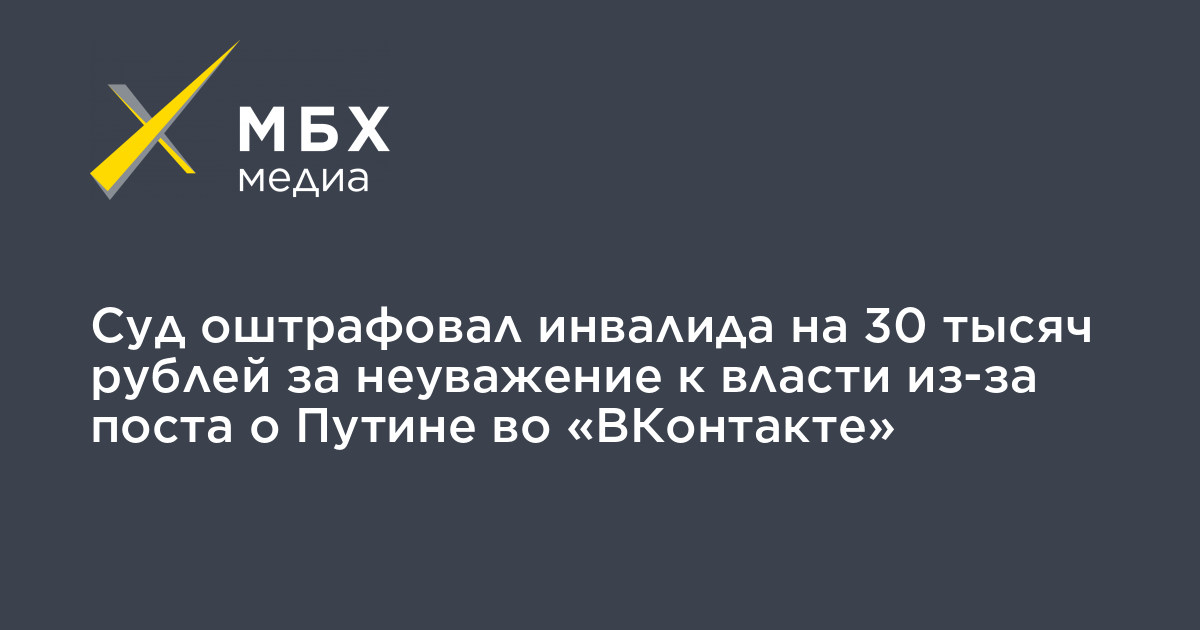 В городе Осинники Кемеровской области суд оштрафовал местного жителя Илью Путевского, у которого есть инвалидность, на 30 тысяч рублей за неуважение к власти из-за поста о Путине во «ВКонтакте», рассказал «МБХ медиа» адвокат международной правозащитной группы «Агора» Станислав Селезнев.