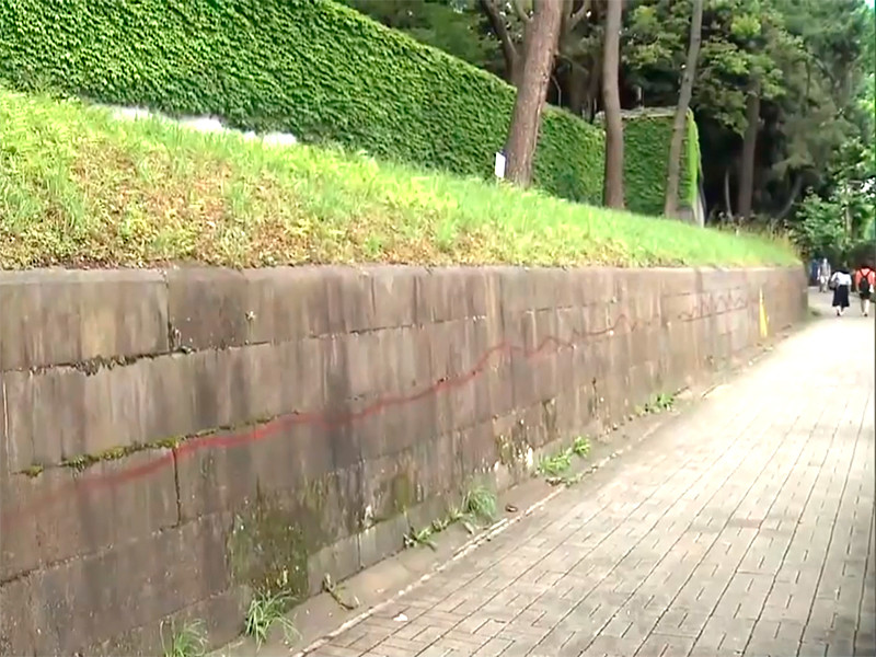 "Красная линия длиной в несколько десятков метров и рисунок птицы появились на каменной стене возле Императорского дворца Акасака в Токио", - пишет портал.