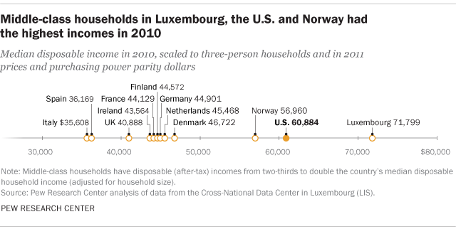 Согласно опубликованному в 2017 году исследованию Pew Research Center, в США к среднему классу принадлежит меньшая, чем в Западной Европе, доля населения (около половины всех американцев при примерно 60% в Европе), но доходы его выше. В 2010 году медианный доход домохозяйства американского среднего класса составлял $60 884 в год, и из всех стран мира более высокий уровень был только в Люксембурге. Для сравнения, британский средний класс, тоже вполне обеспеченный, оказался беднее американского примерно в полтора раза.
