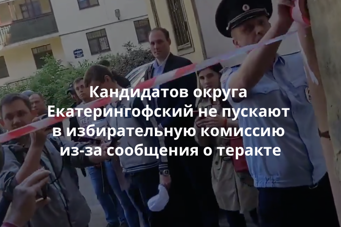 К избирательной комиссии муниципального округа Екатерингофский приехала полиция. На видео, опубликованном фотографом Давидом Френкелем, сотрудник полиции перекрывает вход в арку дома и сообщает, что «поступила информация о готовящемся террористическом акте».