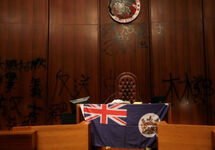 На трибуне, за которой сидит спикер парламента Гонконга, протестующие вывесили британский колониальный флаг.