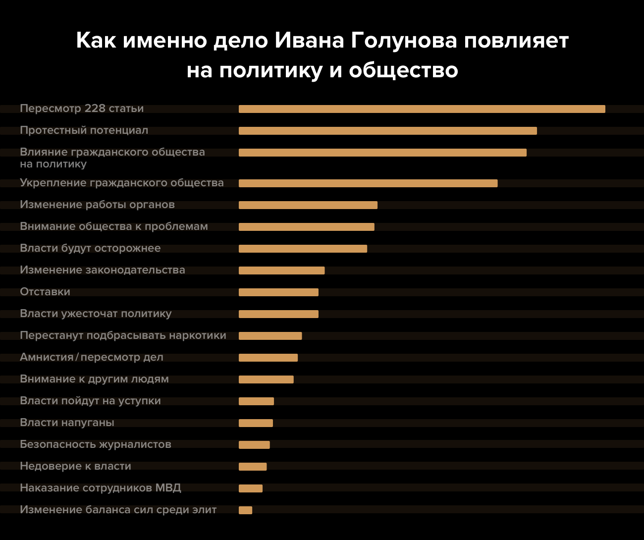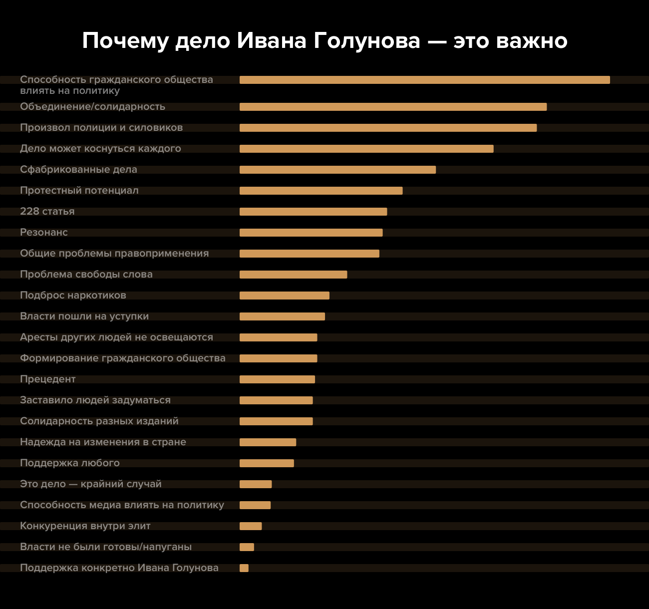 Отвечая на вопросы о деле Голунова, читатели говорили о произволе полиции и других силовиков, а также о том, что нечто подобное может произойти с каждым и от этого «никто не застрахован». «Сегодня Он, завтра Я», — написал один из участников исследования. Среди других популярных ответов на вопрос, почему это дело имеет большое значение, — «сфабрикованные дела», «протестный потенциал» и «228-я статья». «Это касается всех, 228-я статья — народная: подкидывают и чтоб палку срубить, и рот кому надо закрыть», — сказал один из опрошенных.