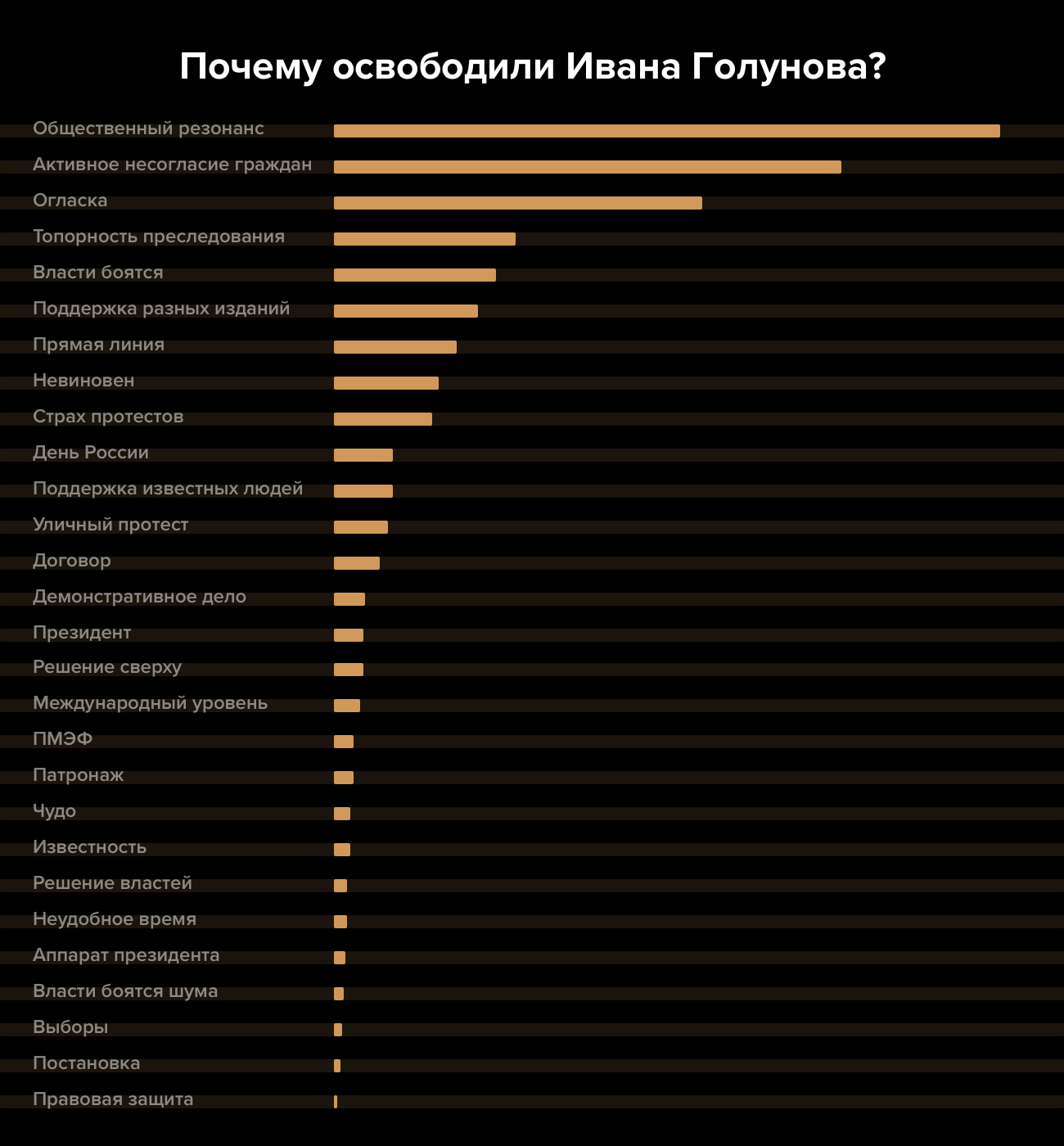 Большинство участников опроса сказали, что освобождения Ивана Голунова удалось добиться благодаря общественному резонансу. Также респонденты считают, что преследование Голунова прекратили из-за того, что дело получило огласку, а полицейские действовали «топорно». Среди других популярных ответов на вопрос, почему освободили Голунова, — «власти боятся» и «поддержка разных изданий».