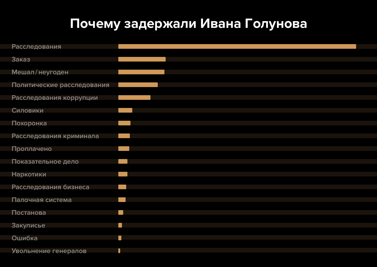 Половина участников опроса (48%) сказали, что Ивана Голунова задержали из-за его расследований, в том числе о похоронном бизнесе, чиновниках и коррупции. «В отместку за его профессиональную деятельность по расследованию коррупции», — сказал один из опрошенных. 10% считают, что Голунова преследовали как неугодного власти человека, еще 9% — что дело носило заказной характер. Только 2% читателей допустили, что Голунов действительно мог быть связан с наркотиками.